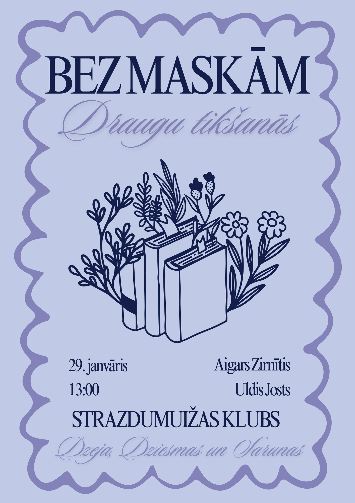 Strazdumuižas klubā (Braila iela 4, Rīga) 2026. gada 29. janvārī, plkst. 13:00 interesenti laipni aicināti uz draugu tikšanos – “Bez maskām”. Piedalīsies Aigars Zirnītis n Uldis Josts, būs dzeja, dziesmas un sarunas. Uz tikšanos!
